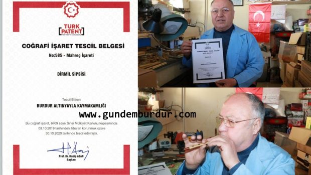 Burdur’da ilkokul 3’üncü sınıfta okuduğu 1968 yılında sipsi çalmaya başlayan Hüseyin Demir (61) 16 yıl önce sipsiye coğrafi işaret almak için çalışmaya başladı. Yerel yönetimlerle bunu sonuçlandıramayan Demir, Altınyayla Kaymakamlığı’na elindeki belgeleri vererek sipsinin tescil edilmesi için bir kez daha Türk Patent Enstitüsüne müracaat etti. Demir’in sabırlı bekleyişi geçtiğimiz günlerde sona erdi. Türk Patent Enstitüsü Dirmil Sipsisine coğrafi işaret verdi.