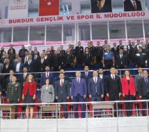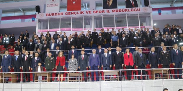 Tören daha sonra Merkez Spor Salonu’nda devam etti. Buradaki törene Vali Ali Arslantaş, Ak Parti Burdur Milletvekili Bayram Özçelik, CHP Burdur Milletvekili Mehmet Göker, Garnizon Komutanı Albay Yavuz Çankaya, Belediye Başkanı Ali Orkun Ercengiz, Cumhuriyet Başsavcısı osman Kara, Adalet Komisyonu Başkanı Hacı Ali Arslan, Baro Başkanı ramazan Gedik, İl Emniyet Müdürü ümit Bitirik, İl Jandarma Komutan Vekili Albay Engin Hatipoğlu. Vali Arslantaş, Garniozn Komutanı Çankaya ve Belediye Başkanı Ercengiz’in törene katılanların bayramını kutlamasının ardından İstiklâl Marşı okundu.