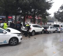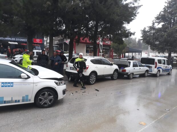 O sırada arkadan gelen birisi polis ekip arabası olmak üzere dört otomobil yağış nedeniyle kayganlaşan yolda duramayarak birbirine girdi.