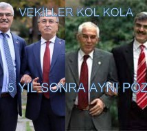 Yıllar önce gazetelere ‘Kanka vekiller’ diye haber olan Bayram Özçelik ve Mehmet Alp’in meclis bahçesinde kol kola verdiği poz bu defa Bayram Özçelik’le Reşat Petek tarafından verildi.