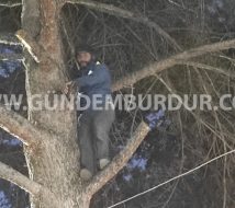 Fatih Kılıçaslan’ın bulunduğu ağaca itfaiyenin merdiveni yanaşamayınca etrafta bulunan ağacın engelleyen dalları kesildikten sonra Kılıçaslan İtfaiyeciler tarafından bulunduğu yerden alındı.