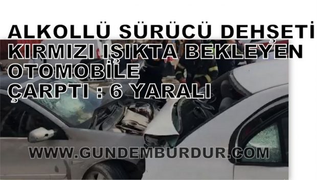 BURDUR’da alkollü sürücünün kırmızı ışıkta bekleyen otomobile çarpması sonucu meydana gelen kazada 6 kişi yaralandı.
