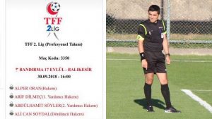 Oran bu pazar günü Bandırma 17 Eylül Stadı’nda oynanacak Bandırmaspor-Bugsaşspor A.Ş. maçında düdük çalacak. Oran’ın yardımcılıklarını Arif Dilmeç ve Abdulhamit Söyler yapacak. Ali Can Soydal ise dördüncü hakem olarak görev yapacak.