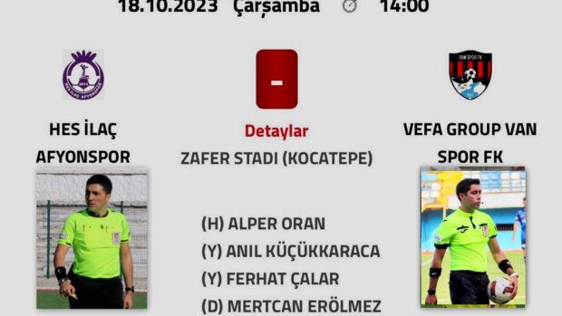 Türkiye Futbol Federasyonu 2’inci Lig Beyaz Grupta oynanacak olan Hes İlaç Afyonspor-Vefa Group Vanspor Futbol Kulübü karşılaşmasını Burdur Bölgesi B Klasman hakemi Alper Oran yönetecek.