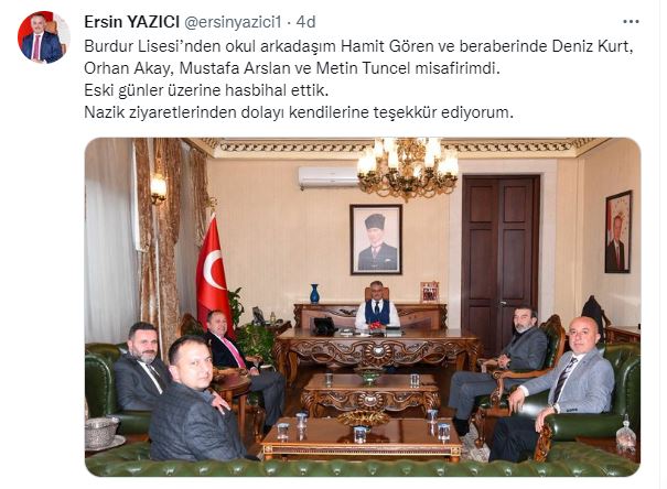 Burdur Lisesi’nde okuduğu yıllarda sınıf arkadaşı olan Burdur Belediye Meclisi Üyesi Hamit Gören ile İş İnsanları Deniz Kurt, Orhan Akay, Mustafa Arslan ve Metin Tuncel vali yazıcıyı makamında ziyaret ederek bir süre görüştüler. Vali Yazıcı ziyaretçileriyle fotoğrafını sosyal medya hesabından “Burdur Lisesi’nden okul arkadaşım Hamit Gören ve beraberinde Deniz Kurt, Orhan Akay, Mustafa Arslan ve Metin Tuncel misafirimdi. Eski günler üzerine hasbihal ettik. Nazik ziyaretlerinden dolayı kendilerine teşekkür ediyorum.” mesajıyla paylaştı.