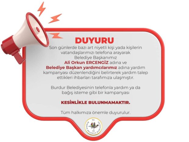 BURDUR Belediyesi’nden yapılan açıklamada Belediye Başkanı Ai Orkun ERcengiz’in adının kullanılarak yardım istenddiği belirtilerek vatandaşlar bu konuda uyarıldı.