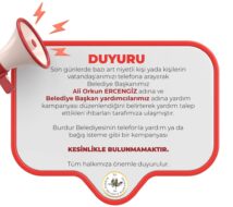 Yapılan açıklamada; “son günlerde bazı art niyetli kişi yada kişilerin vatandaşlarımızı telefonla arayarak Belediye Başkanımız Ali Orkun Ercengiz ve Belediye Başkan Yardımcılarımız adına yardım kampanyası düzenlendiği belirtilerek yardım talep ettikleri ihbarları tarafımıza ulaşmıştır. Burdur Belediyesi’nin telefonla yardım ya da bağış isteme gibi bir kampanyası kesinlikle bulunmamaktır. Tüm halkımıza önemle duyurulur” denildi.