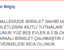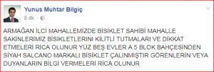 Armağan İlci Mahallesi Muhtarı Yunus Bilgiç mahallesinde meydana gelen bisiklet hırsızlığı sonrası vatandaşları sosyal medya hesabından yaptığı paylaşımla bisikletlerini kilitli tutmaları konusunda uyardı.