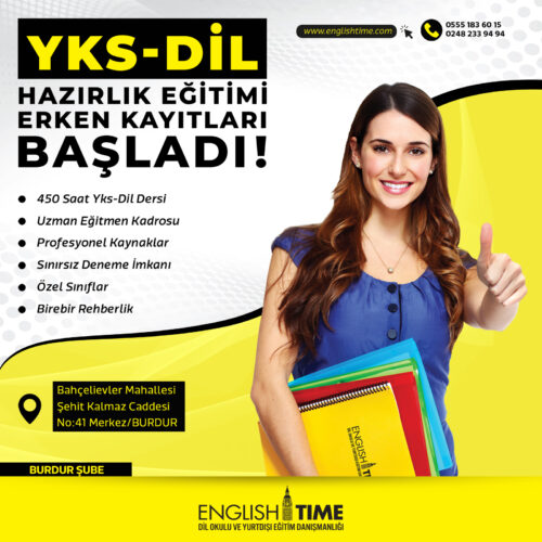 Yabancı dil eğitimi üzerine en başarılı ve Burdur’un en büyük dil okulu olan English Time Dil Okulları Burdur şubesinde 8-14 yaş eğitimleri, yetişkin kur eğitimleri, Yks-Dil, Yds-Yökdil, Toefl, Ielts gibi eğitimler uzman ve yabancı eğitmenler eşliğinde verilİyor. Kurumdan yapılan açıklamada,