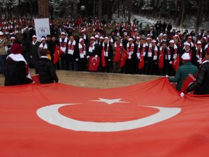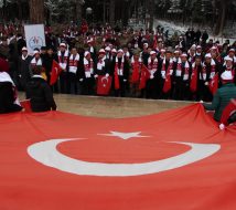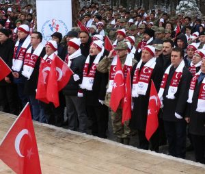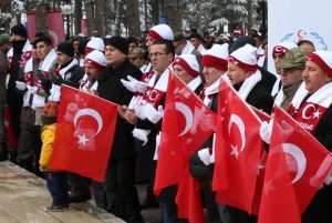 Ellerinde Türk bayrakları ile Şehitliğe kadar yürüyen grup ‘Şehitler Ölmez, Vatan bölünmez’, ‘Ne mutlu Türküm Diyene’, ‘Ya Allah, Bismillah, Allahüekber’ şeklinde sloganlar attı.