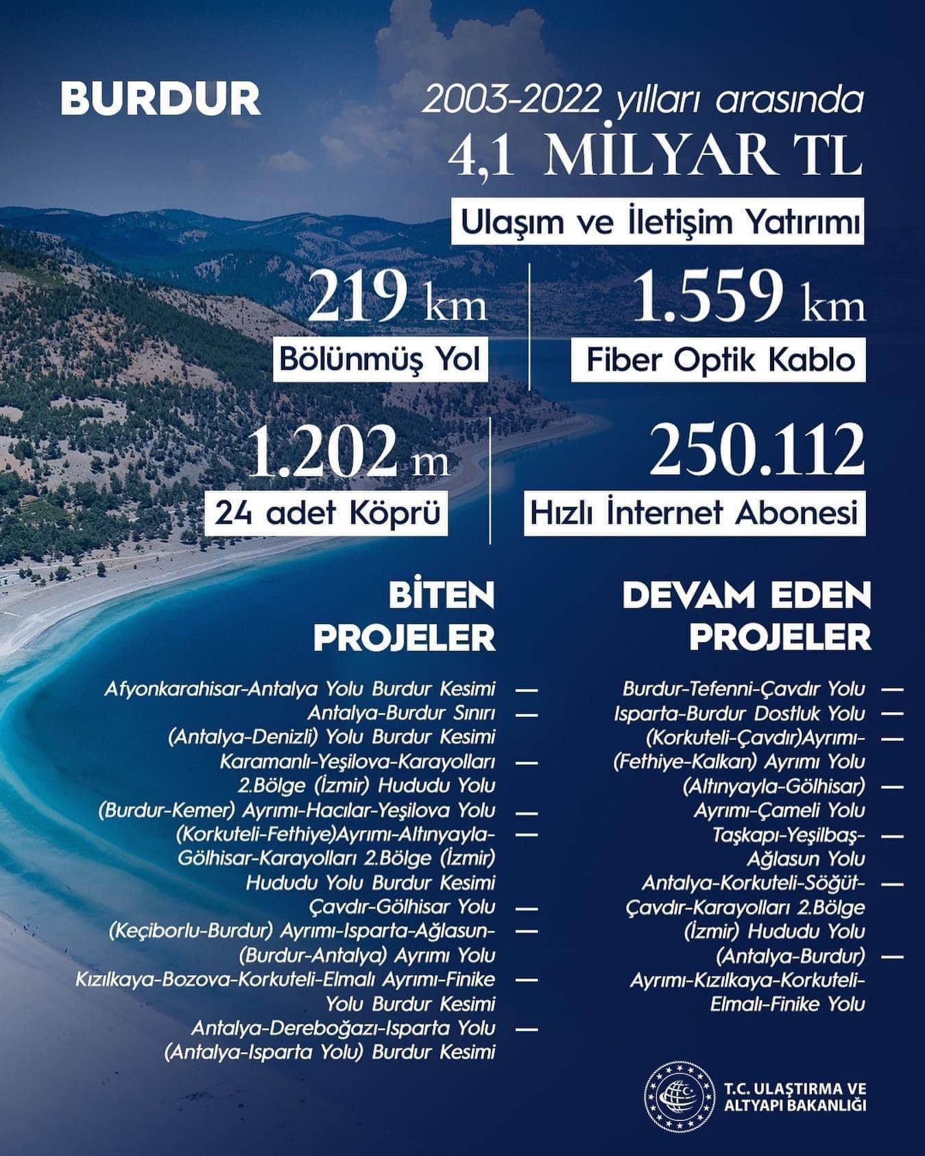Milletvekili Bayram Özçelik, 2003-2022 yılları arasında Burdur’a yapılmış olan 4,1 Milyar TL değerindeki yatırımları şu şekilde açıkladı; “219 kilometre bölünmüş yol, toplamda Bin 202 metre olmak üzere 24 adet köprü, Bin 559 kilometre fiber optik kablo ve 250 Bin 112 hızlı internet abonesi.” Dedi.