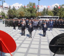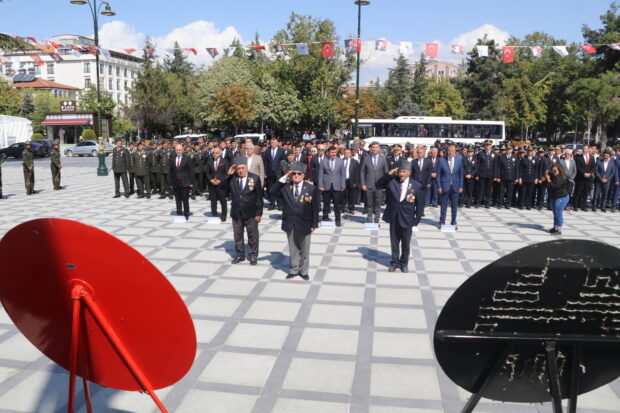 Törende Atatürk Anıtına Vali Arslantaş, Garnizon Komutanı Çankaya, Belediye Başkanı Ercengiz ve Türkiye Muharip Gaziler Derneği Temsilcisi Hasan Okyar tarafından çelenk sunulmasının ardından saygı duruşunda bulunuldu ve İstiklal Marşı okundu.