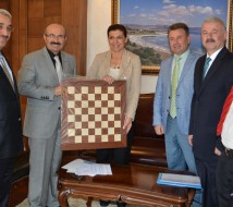 Vali Hasan Kürklü, Satranç Federasyonu Başkanı Gülkız Tülay ve Milli Eğitim Müdürü Mahmut Bayram tarafından Protokol metninin imzalamasının ardından Federasyon Başkanı Gülkız Tülay, Vali Hasan Kürklü’ye satranç takımı hediye etti.