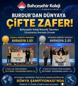 Bahçeşehir Koleji Burdur Kampüsü, uluslararası alanda elde ettiği robotik başarılarla dikkat çekti. Uluslararası Fibonacci Robot Olimpiyatları Avrasya Şampiyonası’nda yarışan Bahçeşehir Koleji öğrencileri, iki farklı kategoride önemli dereceler elde etti.