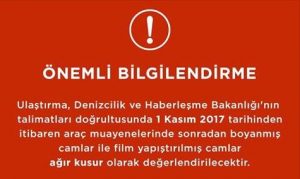 Ulaştırma, Denizcilik ve Haberleşme Bakanlığı’nın  talimatı ile bugünden (01 Kasım 2017) itibaren araç muayenelerinde sonradan boynamış camlar ile film yapıştırılmış camlar ağır kusur sayılarak vizeden geçemeyecek.