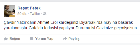 Ak Parti Milletvekili Reşat Petek Çavdır İlçesi Yazır Köyü’nden olan Ahmet Erol’un durumunu sosyal medya hesabından duyurdu. Petek, Erol’un durumunun iyi olduğunu belirterek geçmiş olsun dileğinde bulundu.