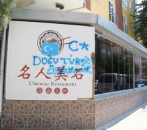 Bahçelievler Mahallesi’nde bulunan Çin Lokantası’nın tabelasına Doğu Türkistan Bayrağı yapıştırıldı ve Doğu Türkistan’a özgürlük sloganı yazıldı.