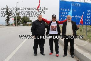 Ön tarafında Cumhurbaşkanı Erdoğan, Başbakan Yıldırım ve MHP Lideri Bahçeli’nin fotoğrafı ve ‘Doğu Türkistan’daki Uygur Türklerini Çin Zulmünden Kurtarmak İçin Evet’mi Başkanlar’, arka tarafından ise 15 Temmzu’da Şehit olan Uygur Türkü Abdulhekim Buğda’nın fotoğrafı ve ‘Gökbayrak’tan Al Bayrağa Feda Olsun’ yazılı tişörtle yürüyüşünü sürdüren Turan, Doğu Türkistan’da birçok gencin Çin yönetimi tarafından hapsedildiğini söyledi. Turan “Camileri yıkıyorlar, Kur’anları yakıyorlar. Çocukları öldürüyorlar.” diye konuştu.