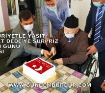 BURDUR’da İl Protokolü 29 Ekim 1923 doğumlu Mehmet Altınkaynak’ı evinde ziyaret ederek doğum günü pastası kesti.