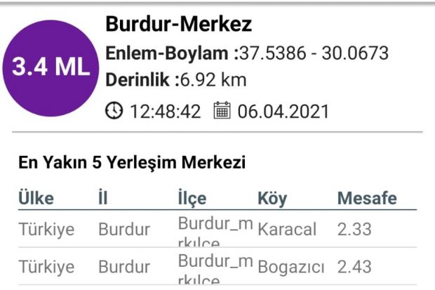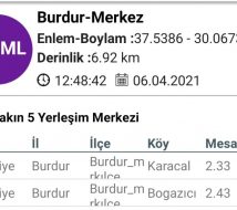 Burdur’da 12.26 sıralarında 3.4 şiddetinde deprem oldu.