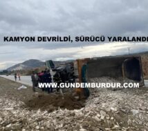 BURDUR’da sürücüsünün direksiyon hakimiyetini kaybettiği kamyon devrildi, sürücü yaralandı.