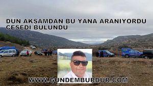 Denizli’nin Acıpayam İlçesi ile Burdur’un Yeşilova İlçesi Güney Köyü arasındaki Sırçalık mevkiine dün av için gelen Ahmet Tokcan (44) isimli şahısdan haber alınamaması üzerine yakınları kayıp başvurusunda bulundu. Burdur İl Jandarma Komutanlığı ekipleri Acıpayam İlçe Jandarma Komutanlığı ekipleri ile Burdur ve Denizli Afad İl Müdürlüğü ekipleri tarafından dün akşamdan bu yana aranan şahıs bugün sabah 09.00 sıralarında Yeşilova İlçesi Güney Köyü sulama göleti yakınlarında ölü olarak bulundu.