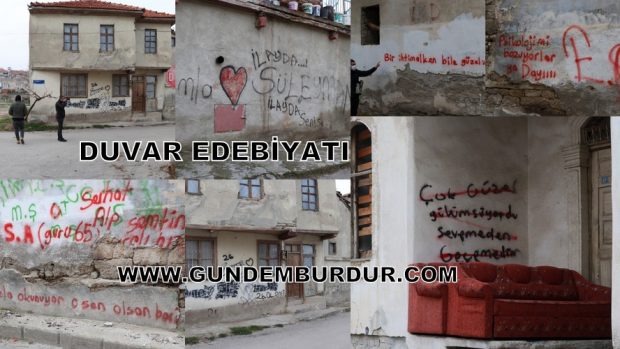 Burdur’da da terk edilmiş evlerin duvarlarına yazılan yazılarda ilginç mesajlar yer alıyor. Kimisi aşkını ilan ederken, kimisi sitem ediyor. Kimisi de içinde bulunduğu psikolojik durumu duvara yazarak anlatıyor.