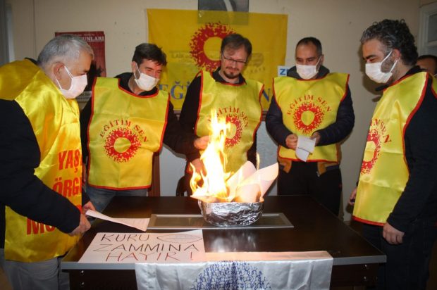 Eğitim Sen Burdur Şubesi üyeleri memur maaş zamlarını protesto etmek için bordro yakma eylemi yaptı.  Eğitim Sen Burdur Şube Başkanı Sedat Çiçek konuyla ilgili yaptığı açıklamada; ” Her gün gözümüzü iğneden ipliğe gelen zamlarla açıyor, derinleşen kriz ve pandemi nedeniyle nefes almanın bile zorlaştığı bir dönemden geçiyoruz.  Gericilik, kutuplaşma, kayyum politikaları, OHAL uygulamaları, pandemi, hayat pahalılığı, geçim derdi, işsizlik ve daha saymakla bitmeyecek sorunlar yumağı ile kuşatıldık. Siyasal iktidar halkın, emekçilerin yaşadığı dertleri, sıkıntıları çözmek yerine attığı her adımda sorunlar yumağını büyütüyor. Acı reçete yine emekçilerin, yoksullaştırılan halkın payına düşüyor.  Milyonlarca kamu emekçisi, işçi,  emekli çarşıda pazarda yaşanan gerçek enflasyonu TÜİK’in perdeleyen rakamlarıyla, sahte verilerle açlığa mahkûm edilmek isteniyor.  Son bir yıl içinde doğalgaza %32, elektriğe %31,  baklagillere %60, peynire %27, yumurtaya %80,  ayçiçeği yağına %50,  köprü ve otoyol geçiş ücretlerine %26 zam yapıldı.  Açlık sınırının 2.600, yoksulluk sınırının 8.600 TL’yi aştığı bugünün koşullarında sıra emekçilere gelince “kaynak yok” diyorlar.  Ama 5’li çeteye vergi muafiyetleri ve istisnalar adı altında bütçeden devasa paralar aktarırken kaynak sıkıntısı çekmiyorlar.