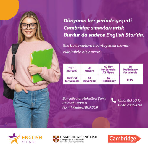 Cambrige Artık Burdur’da . Değişen ve gelişen dünyada İngilizce artık bir artı değil, herkesin standart bir ihtiyacı haline geldi. Küresel ekonomi ve eğitim yaşamında öğrencisinden öğretmenine, esnafından yöneticisine birçok insanın eksikliğini çektiği yabancı dil sorununa Burdur’daki çözüm adresi Cambridge Assessment English sistemiyle eğitim ve sınavlarını gerçekleştiren English Star Yabancı Dil Kursları 1 Eylül 2023’ten itibaren kayıtlara başladı. İlkokul, ortaokul, lise, üniversite ve akademik planları olanlar, her alanda dünyada her yerde geçerli bir sertifikayı Cambrige Sınav Hazırlık Merkezi haline gelen English Star Cambrige Dil Okulu’ndan alabilme imkanı ! Üstelik ilk sınav ise 9 Haziran 2024’te!