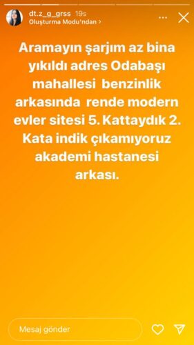 Depremin ardından yakınlarının kendisine ulaşmaya çalıştığı esnada sosyal medya hesabından, “aramayın, şarjım az, bina yıkıldı. adres Odabaşı mah. Benzinlik arkasında Rende modernevler sitesi 5. kattaydık. ikinci kata indik çıkamıyoruz. Akademi Hastanesi arkası” paylaşımı yapan Ziynet Gürses ve ailesinden 3 saat sonra sevindirici haber geldi.