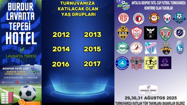 29 30 31 Ağustos tarihlerinde Burdur Lavanta Tepesi Otel’de yurt içi ve yurt dışı profesyonel ve amatör 25 takımın 2012-2013-2014-2015-2016-2017 doğumlu sporcularının katılacağı küçükler futbol turnuvası yapılacak. Üç gün sürecek turnuvada geleceğin yıldız adayları futbol coşkusu ve 30 Ağustos Zafer bayramı coşkusunu bir arada yaşayacak. BDSpor Tatil Cup tarafından organize edilen turnuvaya yerli ve yabancı yaklaşık 1000’e yakın sporcu katılacak. Turnuvada Süper Lig takımlarımızdan ANTALYASPOR AKADEMİ, FETHİYESPOR, DARICASPOR profesyonel futbol takımlarının yanısıra DUBAİ SPORTS ve IRAK OUARK takımları yer alacak. .Lavanta Tepesi Otel’in konaklama ve antrenman sahalarında gerçekleşecek turnuva ilimizde bu kapsamda düzenlenen ilk turnuva olacak.