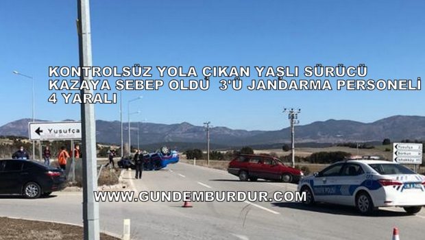 BURDUR’un Gölhisar İlçesi Yusufça Beldesi’nde yola kontrolsüz çıkan otomobil sürücüsü kazaya sebep oldu. 3 Jandarma personeli ile otomobil sürücüsü yaralandı.