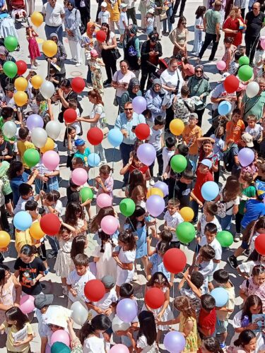 Öğrenciler okulun son gününde sınıflarında karnelerini aldıktan sonra ellerinde balonlarla okul bahçesinde toplandı. 10’dan geriye sayan öğrenciler ellerindeki balonları ‘savaşlarda çocuklar ölmesin’ diyerek gökyüzüne bıraktı.