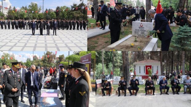 Törene katılanlar daha sonra Asri Mezarlıkta bulunan şehitliğe giderek şehit mezarlarına karanfil bıraktı. Kur’an-ı Kerim okunmasının ardından İl müftüsü Enver Türkmen dua etti. İl Jandarma Komutanı Albay Mustafa Güder “183 yıl gibi köklü bir tarihe sahip olan Jandarma Teşkilatımız kuruluşundan bugüne ülkemizin bölünmez bütünlüğü, milletimizin huzur ve güvenliği ile kamu düzeninin sağlanması için fedakarca hizmet ediyor. Bizde önce Ulu Önder Atatürk’e çelenk sunduk. Şimdide kuruluş yıl dönümü dolayısıyla şehitliğimizi ziyaret ettik. Ezanımızı dindirmeyen, bayrağımızı indirmeyen, vatanımızı böldürmeyen şehitlerimize dualarımızı