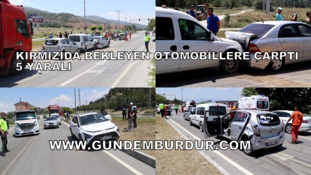 Burdur’dan yüklediği briketleri Denizli’ye götürmekte olan Hasan Ş. yönetimindeki 20 AGK 949 Plakalı kamyon Burdur-Fethiye Karayolu Bahçeşehir Koleji Kavşağı’nda kırmızı ışıkta bekleyen otomobile çarptı. Çarpmanın etkisiyle 5 otomobil birbirine girdi.