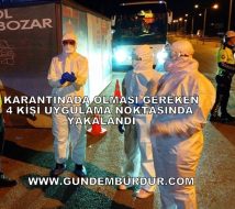 BURDUR’da karantinada olması gerek 4 kişi Kışla Mahallesi uygulama noktasında polisin dikkati sayesinde yakalandı. Yakalanan 4 kişi ambulans ile KYK yurduna yerleştirildi.