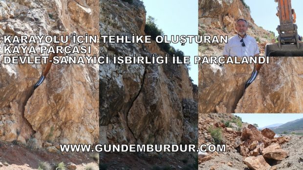KARAYOLU İÇİN TEHLİKE OLUŞTURAN KAYA PARÇASI DEVLET-SANAYİCİ İŞBİRLİĞİ İLE PARÇALANDI | Gündemburdur.com