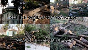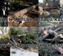 BURDUR’da Şeker İşçi Evleri Mahallesi’ndeki Caminin bahçesinde bulunan ve şadırvan ve tuvalet yapılacağı gerekçesi ile kesilen 40-50 yıllık çam ağaçları ortada kaldı.