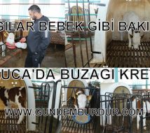Aksöz ” burası buzağı kreşi. Buzağılar yaklaşık 60 gün boyunca burada duruyor. Buzağı kulubesini yerden yüksek tutuyoruz ki, buzağıların altları ıslanmasın ve akciger enfeksiyonuna kapılmasınlar, daha sağlıklı olsunlar. Etrafını da soğuk kış günlerinde rüzgar almasını engellemek için kapattık. Buzağıları, sabah akşam bebek besler gibi elimizle emziriyoruz.” dedi.