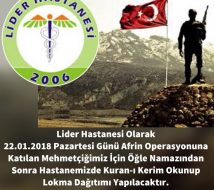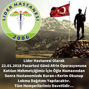 Bucak ilçesi’ndeki Özel Lider Hastanesi 22.01.2018 Pazartesi Günü Afrin Operasyonuna Katılan Mehmetçikler için Öğle namazından sonra hastanede Kur’an-ı Kerim okutacak. Vatandaşlara Lokma dağıtımı da yapılacak. Hastane yetkilileri etkinliğe tüm vatandaşları davet etti.