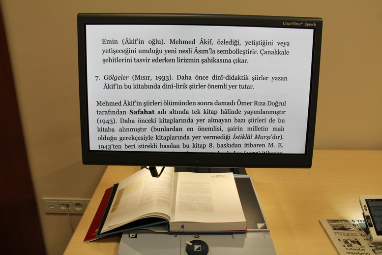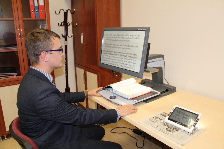Çalışma kapsamında aldıkları yazıyı sese dönüştüren, harfleri büyüten, Braille alfabesinde çıktı verebilen cihazlar ve büyüteç ile az gören ya da hiç göremeyen engellilere kütüphane hizmeti başlattıklarını anlatan Kutluay, şunları söyledi ;  “Bu sistemin bir metni az görenler için 80 kat büyütme özelliği var. Metni aynı zamanda sese de dönüştürebiliyor. Diğer cihazımız, program üzerinden metnin fotoğrafını çekerek anında sese ve metne dönüştürüyor. Bu sistem hiç  göremeyenlere yönelik. İsterlerse Braille alfabesinde çıktı alabiliyorlar. Öğrencilerimiz, kütüphanemizde bulunan taşınabilir büyüteci zimmet karşılığında yanlarında götürüp faydalanabilir. Kütüphanede bulunan bir görevlimiz görme engelli arkadaşlarımıza teknik konularda bilgi veriyor ve yardımcı oluyor.”