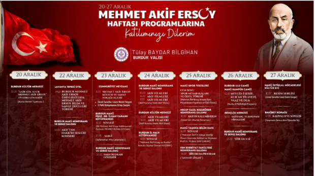 Burdur’da, İstiklal Marşı şairi Mehmet Akif Ersoy anısına düzenlenen Mehmet Akif Ersoy Haftası etkinlikleri, 20–27 Aralık tarihleri arasında birbirinden zengin programlarla gerçekleştirilecek. Bir hafta boyunca tiyatrodan söyleşiye, sergiden şiir gecesine kadar çok sayıda kültürel ve sanatsal etkinlik Burdurlularla buluşacak.