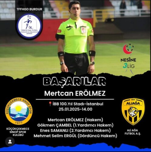 Burdur Bölgesi klasman hakemi Mertcan Erölmez 25 Ocak günü saat 14.00’da İBB 100’üncü yıl stadında oynanacak Nesine 3’üncü Lig 3’üncü grup İstanbul Küçükçekmece Sinop Spor Kulübü-Aliağa Futbol A.Ş. karşılaşmasında düdük çalacak. Erölmez’in yardımcılıklarını Gökmen Çambeli ile Enes Samanlı yapacak. Karşılaşmanın dördüncü hakemi Mehmet Selim Ergül, gözlemcisi ise Murat Orhan. www.gundemburdur.com olarak Erölmez’e başarılar diliyor, Allah hakem şansı versin dileğinde bulunuyoruz.