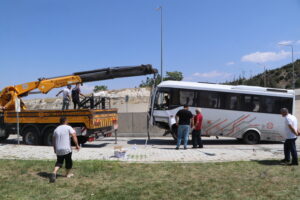Isparta’dan Burdur’a gelen ve içerisinde 18 yolcunun bulunduğu Mustafa S. yönetimindeki 15 SA 379 Plakalı yolcu midibüsü freninin patlaması sonucu Burdur Otogarına girişte 2 metre yüksekten aşağıya düştü, midibüs aydınlarma direğine çarparak durabildi.