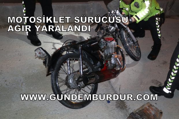 Burdur’dan Tefenni istikametine gitmekte olan İsmail Efe U. (17) yönetimindeki motosiklet saat 24.30 sıralarında sürücünün direksiyon hakimiyetini kaybetmesi sonucu Serenler Oteli yakınlarında refüje devrildi. Kazada ağır yaralanan motosiklet sürücüsü kazayı görenlerin haber vermesi üzerine gelen Ambulansla Burdur Devlet Hastanesi’ne götürülerek tedaviye alındı. İsmail Efe U. ‘nun tedavisi yoğun bakım servisinde sürdürülüyor. Polis kazayla ilgili soruşturma başlattı.