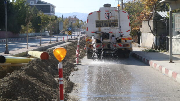 BURDUR’da Menderes Mahallesi muhtarı Onur Hoşafçı, Doğalgaz kazısı yapılan caddede toza engel olmak için kendi imkanları ile caddeyi suluyor.