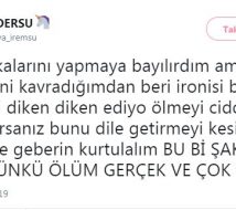 İrem Su paylaşımında “ölüm şakalarını yapmaya bayılırdım ama işin ciddiyetini kavradığımdan beri ironisi bile tüylerimi diken diken ediyo ölmeyi cidden istemiyorsanız bunu dile getirmeyi kesin ya da Bi köşede geberin kurtulalım BU Bİ ŞAKA DEĞİL ÇÜNKÜ ÖLÜM GERÇEK VE ÇOK YAKIN