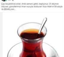 Bütüner çay bardağı fotoğrafı ile yatpığı paylaşımında “Çayı koyabilirsin evlat. Artık zamanı geldi, başlıyoruz. Ol deyince olduran, gönüllerimizi iman nuruyla dolduran Yüce Allah’ın 99 adıyla YA BİSMİLLAH…” ifadelerine yer verdi.
