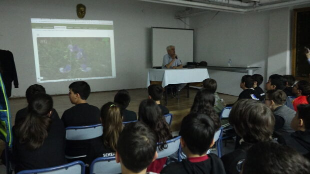 Okul salonundaki konferansta Prof.Dr. Hasan Genç öğrencilere Burdur ve çevresindeki Biyoçeşitliliğin nedenleri ve korunma yolları hakkında bilgi verdi.