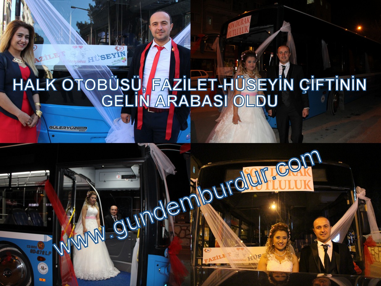 Burdur Öğretmenevi’nde dünyaevine giren Hüseyin ve Fazilet çiftinin gelin arabası Hüseyin’in 15 M 0008 Plakalı Halk otobüsü oldu.